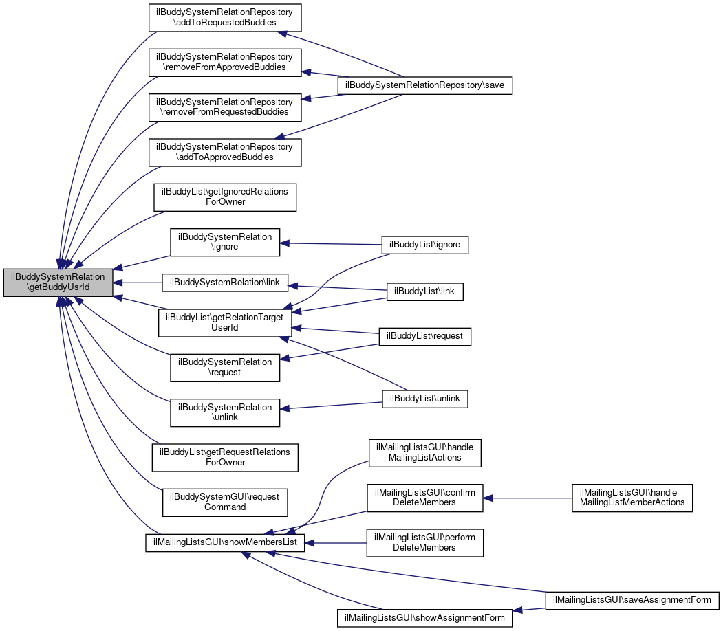 Referenced by ilBuddySystemRelationRepository\addToApprovedBuddies(), ilBuddySystemRelationRepository\addToRequestedBuddies(), ilBuddyList\getIgnoredRelationsForOwner(), ilBuddyList\getRelationTargetUserId(), ilBuddyList\getRequestRelationsForOwner(), ignore(), link(), ilBuddySystemRelationRepository\removeFromApprovedBuddies(), ilBuddySystemRelationRepository\removeFromRequestedBuddies(), request(), ilBuddySystemGUI\requestCommand(), ilMailingListsGUI\showMembersList(), and unlink().