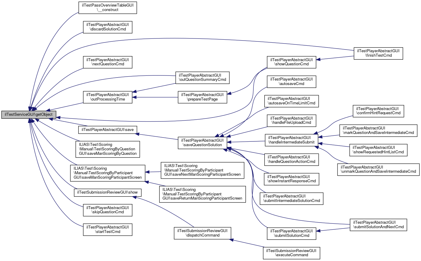 Referenced by ilTestPassOverviewTableGUI\__construct(), ilTestPlayerAbstractGUI\discardSolutionCmd(), ilTestPlayerAbstractGUI\finishTestCmd(), ilTestPlayerAbstractGUI\nextQuestionCmd(), ilTestPlayerAbstractGUI\outProcessingTime(), ilTestPlayerAbstractGUI\outQuestionSummaryCmd(), ilTestPlayerAbstractGUI\save(), ILIAS\Test\Scoring\Manual\TestScoringByQuestionGUI\saveManScoringByQuestion(), ILIAS\Test\Scoring\Manual\TestScoringByParticipantGUI\saveManScoringParticipantScreen(), ilTestSubmissionReviewGUI\show(), ilTestPlayerAbstractGUI\showQuestionCmd(), ilTestPlayerAbstractGUI\skipQuestionCmd(), and ilTestPlayerAbstractGUI\startTestCmd().