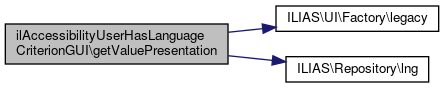 Here is the call graph for this function:| ilAccessibilityUserHasLanguageCriterionGUI::getValuePresentation | ( | ilAccessibilityCriterionConfig | $config, |
