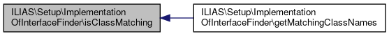 Here is the call graph for this function:| ILIAS\Setup\ImplementationOfInterfaceFinder::isClassMatching | ( | string | $interface, |