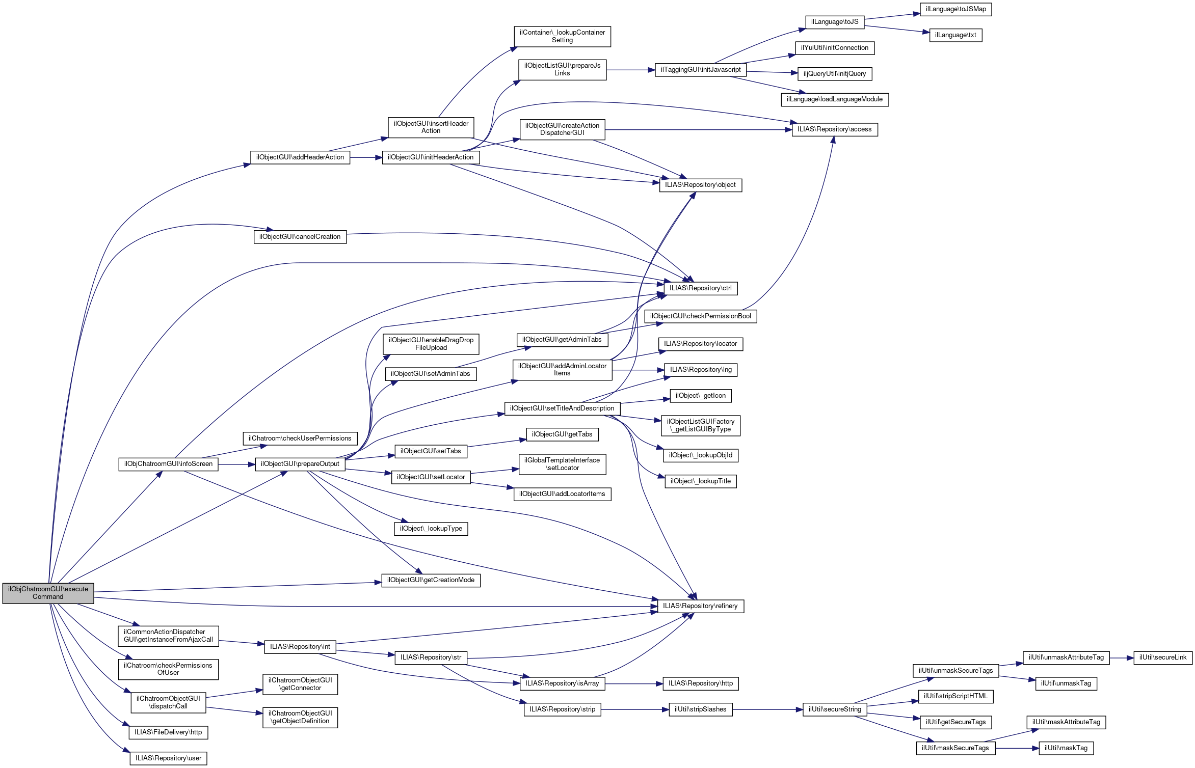Here is the call graph for this function:| ilObjChatroomGUI::executeCommand | ( | ) |