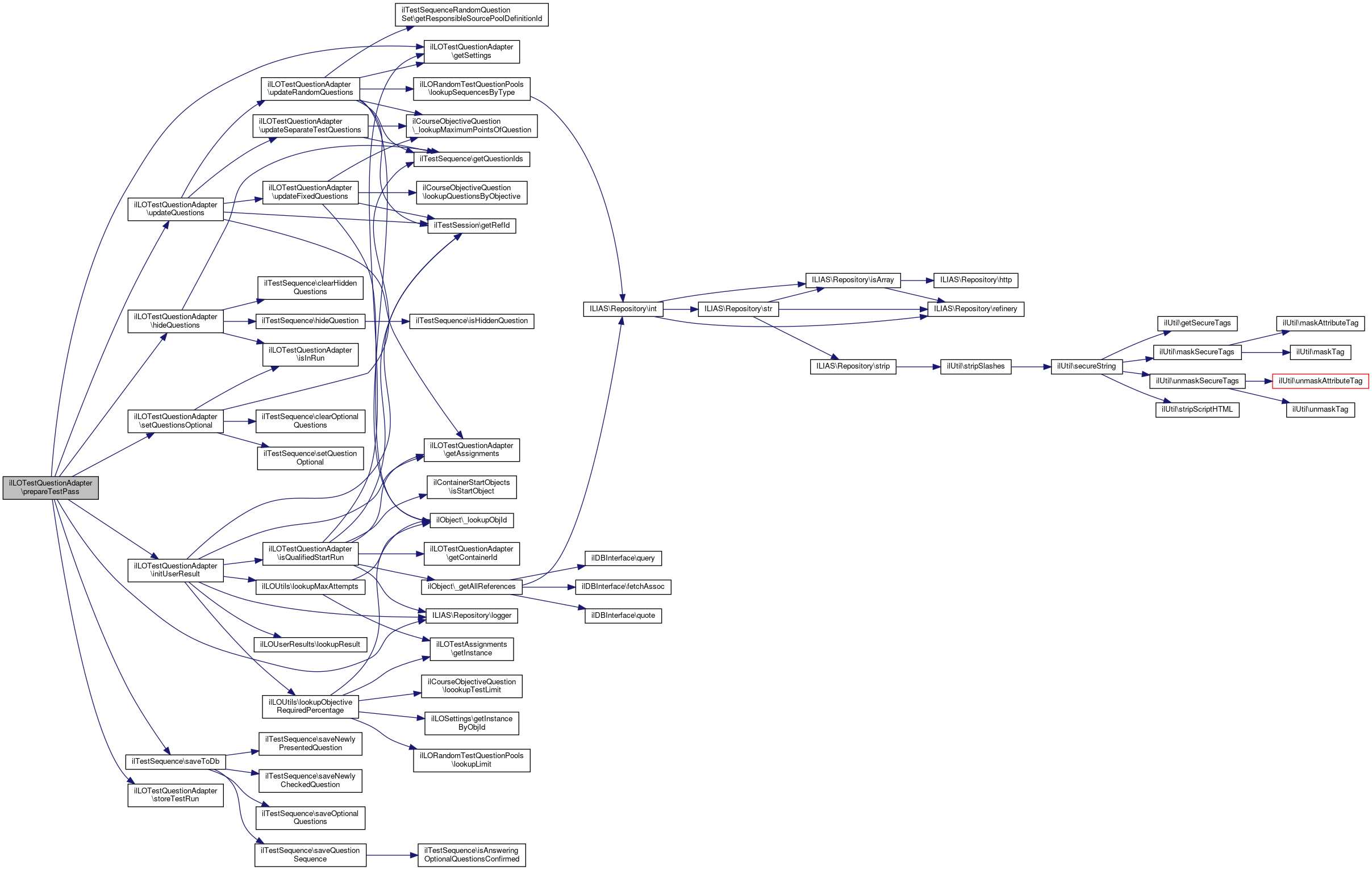 Here is the call graph for this function:| ilLOTestQuestionAdapter::prepareTestPass | ( | ilTestSession | $a_test_session, |
