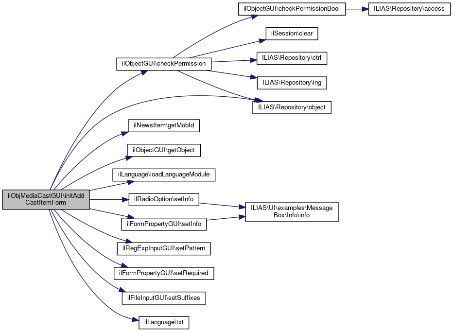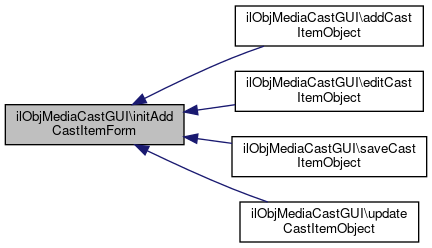 Here is the call graph for this function:| ilObjMediaCastGUI::initAddCastItemForm | ( | string | $a_mode = "create" | ) |