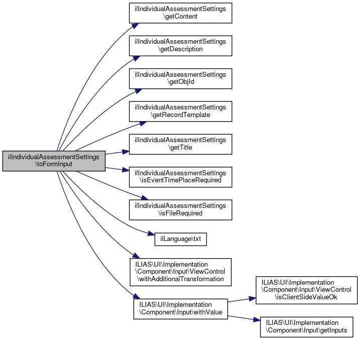 Here is the caller graph for this function:| ilIndividualAssessmentSettings::toFormInput | ( | Field\Factory | $input, |