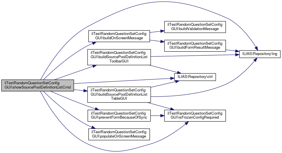 References $source_pool_definition_list, buildOnScreenMessage(), buildSourcePoolDefinitionListTableGUI(), buildSourcePoolDefinitionListToolbarGUI(), ilTestRandomQuestionSetConfigStateMessageHandler\CONTEXT_POOL_SELECTION, ILIAS\Repository\ctrl(), isFrozenConfigRequired(), ILIAS\Repository\lng(), populateOnScreenMessage(), and preventFormBecauseOfSync().