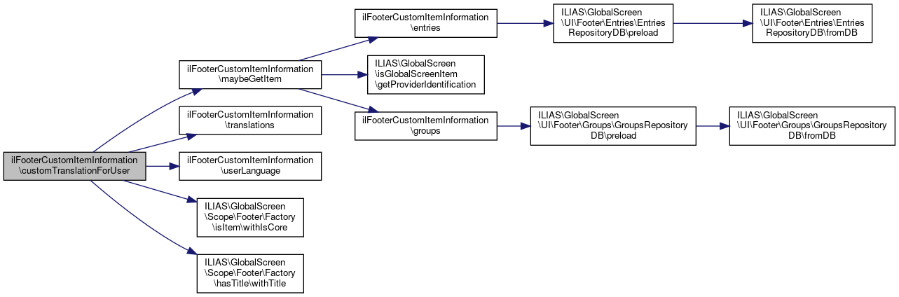 Here is the call graph for this function:| ilFooterCustomItemInformation::customTranslationForUser | ( | hasTitle | $item | ) |
