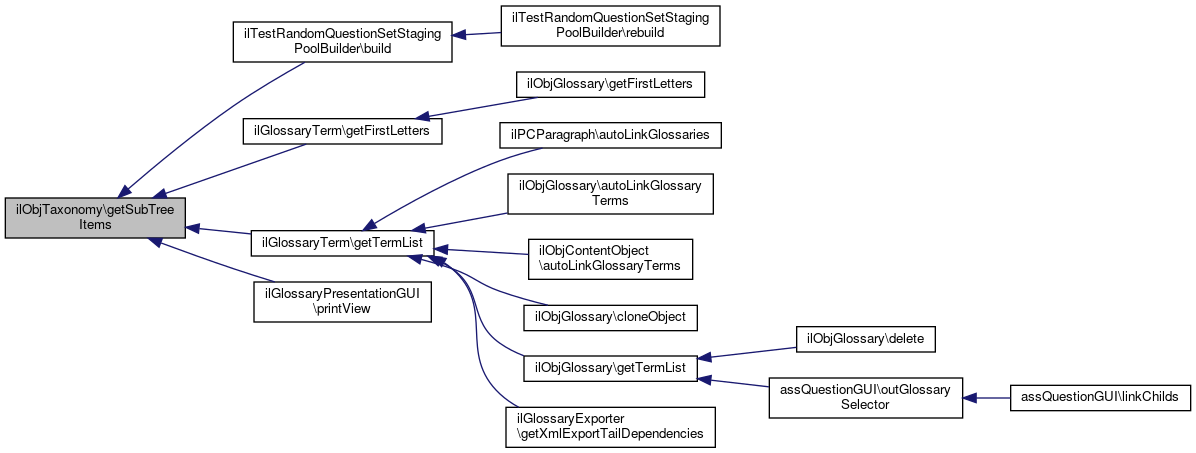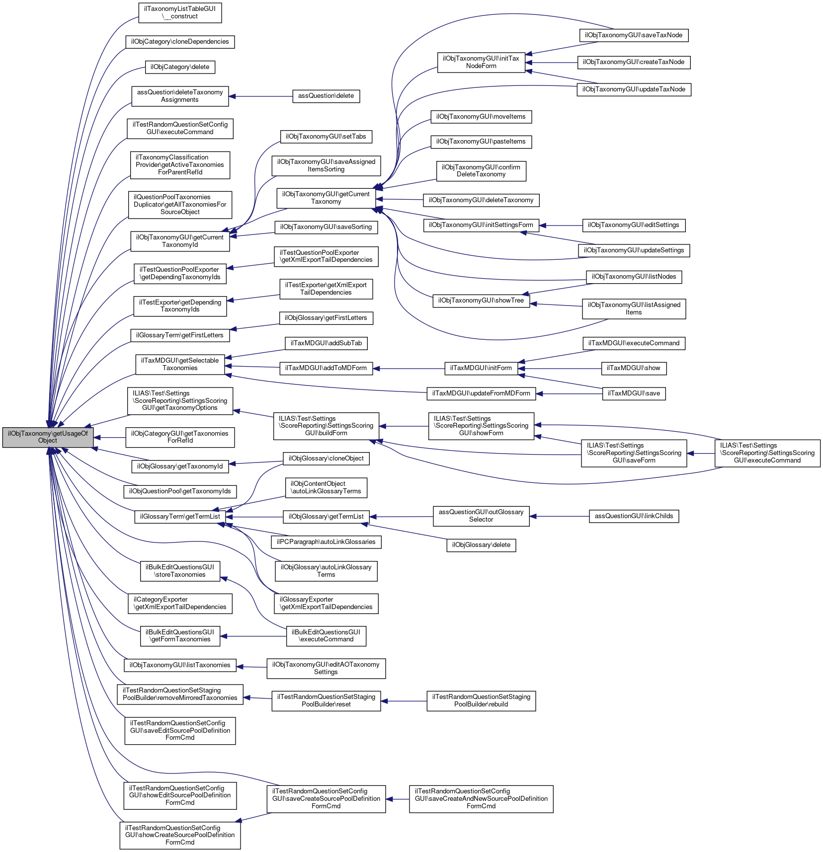 Referenced by ilTaxonomyListTableGUI\__construct(), ilObjCategory\cloneDependencies(), ilObjCategory\delete(), assQuestion\deleteTaxonomyAssignments(), ilTestRandomQuestionSetConfigGUI\executeCommand(), ilTaxonomyClassificationProvider\getActiveTaxonomiesForParentRefId(), ilQuestionPoolTaxonomiesDuplicator\getAllTaxonomiesForSourceObject(), ilObjTaxonomyGUI\getCurrentTaxonomyId(), ilTestQuestionPoolExporter\getDependingTaxonomyIds(), ilTestExporter\getDependingTaxonomyIds(), ilGlossaryTerm\getFirstLetters(), ilBulkEditQuestionsGUI\getFormTaxonomies(), ilTaxMDGUI\getSelectableTaxonomies(), ilObjCategoryGUI\getTaxonomiesForRefId(), ilObjGlossary\getTaxonomyId(), ilObjQuestionPool\getTaxonomyIds(), ILIAS\Test\Settings\ScoreReporting\SettingsScoringGUI\getTaxonomyOptions(), ilGlossaryTerm\getTermList(), ilGlossaryExporter\getXmlExportTailDependencies(), ilCategoryExporter\getXmlExportTailDependencies(), ilObjTaxonomyGUI\listTaxonomies(), ilTestRandomQuestionSetStagingPoolBuilder\removeMirroredTaxonomies(), ilTestRandomQuestionSetConfigGUI\saveCreateSourcePoolDefinitionFormCmd(), ilTestRandomQuestionSetConfigGUI\saveEditSourcePoolDefinitionFormCmd(), ilTestRandomQuestionSetConfigGUI\showCreateSourcePoolDefinitionFormCmd(), ilTestRandomQuestionSetConfigGUI\showEditSourcePoolDefinitionFormCmd(), and ilBulkEditQuestionsGUI\storeTaxonomies().