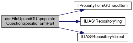 Here is the call graph for this function:| assFileUploadGUI::populateQuestionSpecificFormPart | ( | ilPropertyFormGUI | $form | ) |