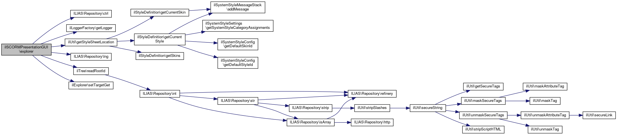 Here is the call graph for this function:| ilSCORMPresentationGUI::explorer | ( | string | $a_target = "sahs_content" | ) |