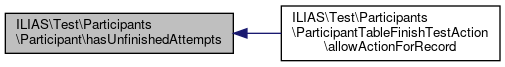 Here is the caller graph for this function:| ILIAS\Test\Participants\Participant::hasUnfinishedAttempts | ( | ) |