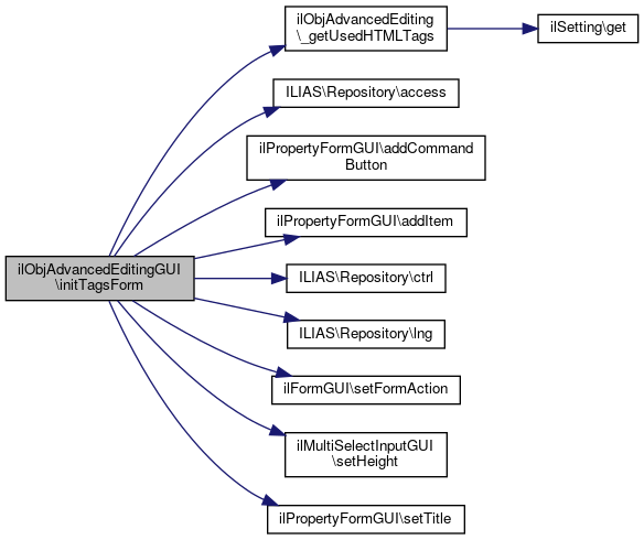 References $form, ilObjAdvancedEditing\_getUsedHTMLTags(), ILIAS\Repository\access(), ilPropertyFormGUI\addCommandButton(), ilPropertyFormGUI\addItem(), ILIAS\Repository\ctrl(), ILIAS\Repository\lng(), ilFormGUI\setFormAction(), ilMultiSelectInputGUI\setHeight(), and ilPropertyFormGUI\setTitle().
