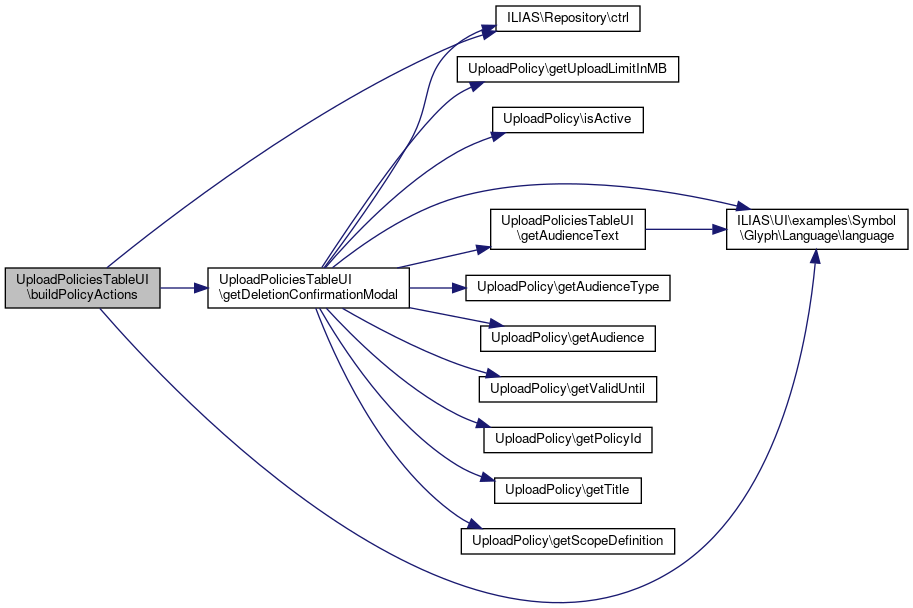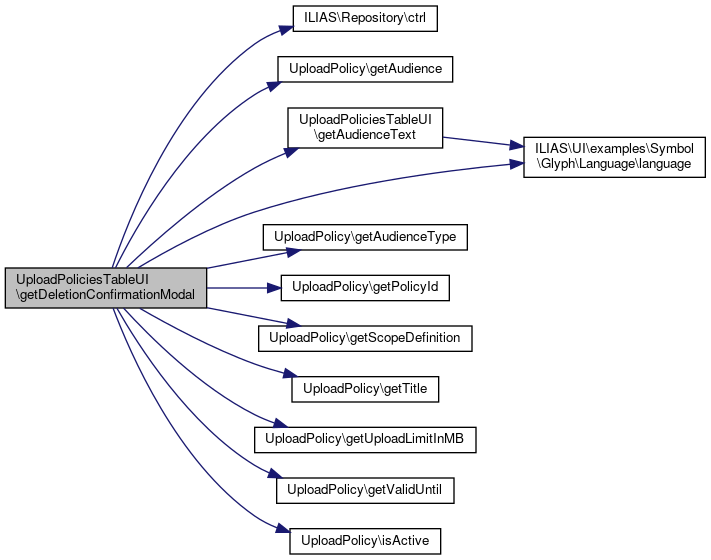 References ilUploadLimitsOverviewGUI\CMD_DELETE_UPLOAD_POLICY, ILIAS\Repository\ctrl(), UploadPolicy\getAudience(), getAudienceText(), UploadPolicy\getAudienceType(), UploadPolicy\getPolicyId(), UploadPolicy\getScopeDefinition(), UploadPolicy\getTitle(), UploadPolicy\getUploadLimitInMB(), UploadPolicy\getValidUntil(), UploadPolicy\isActive(), and ILIAS\UI\examples\Symbol\Glyph\Language\language().