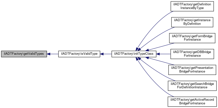 Here is the call graph for this function:| ilADTFactory::getValidTypes | ( | ) |