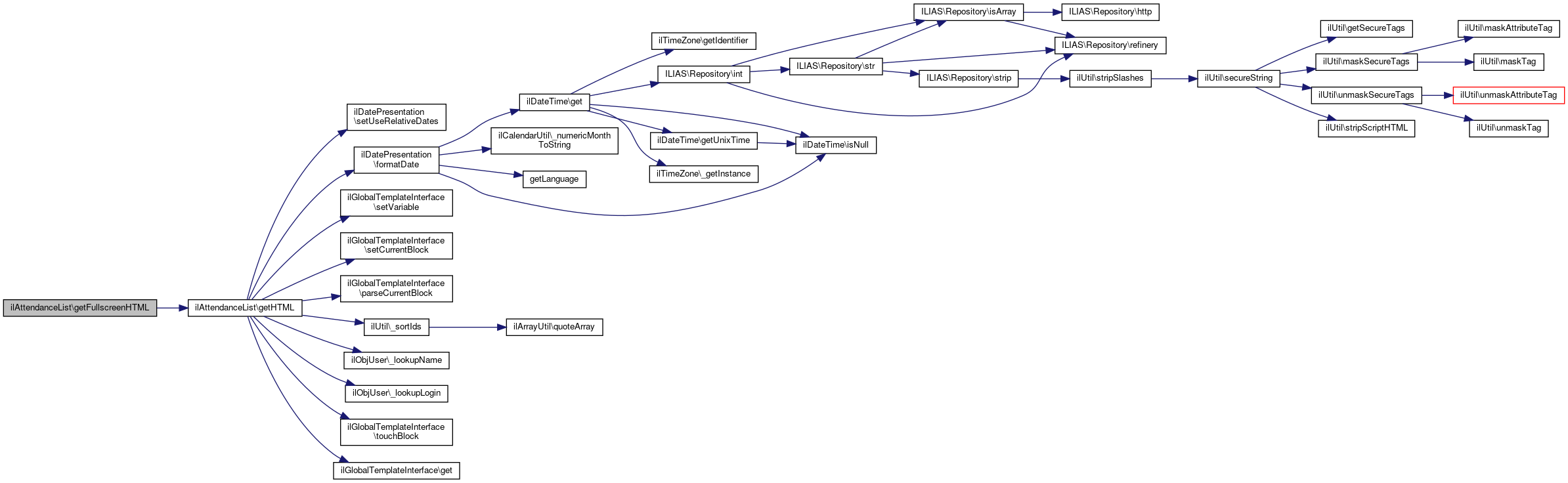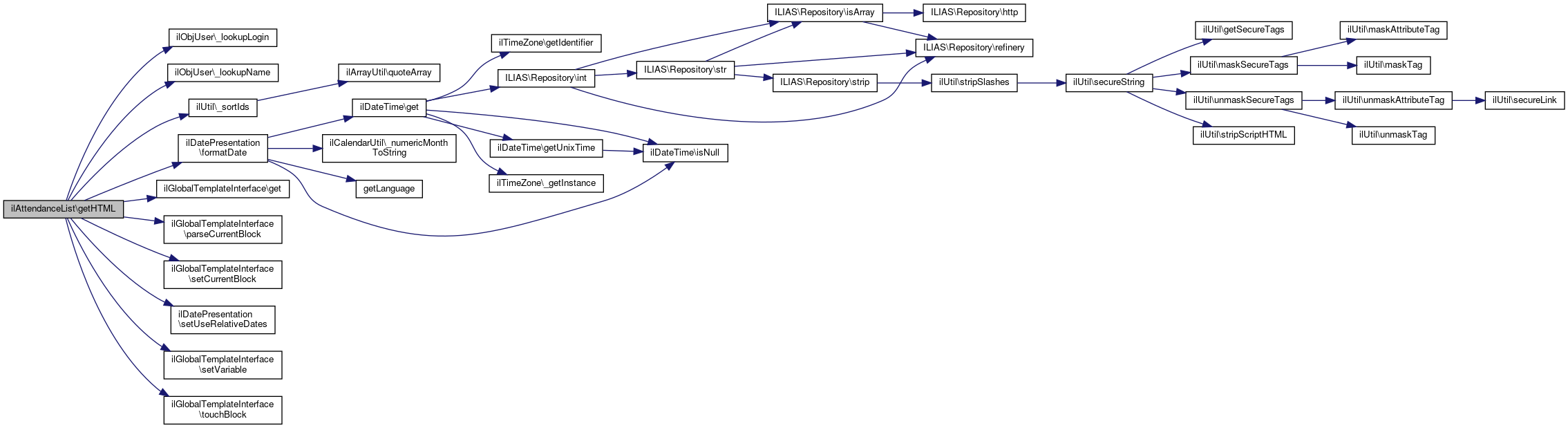 Here is the call graph for this function:| ilAttendanceList::getHTML | ( | ) |