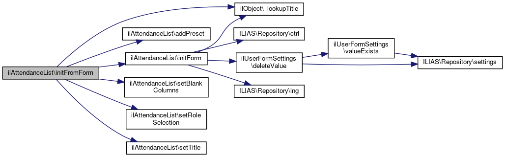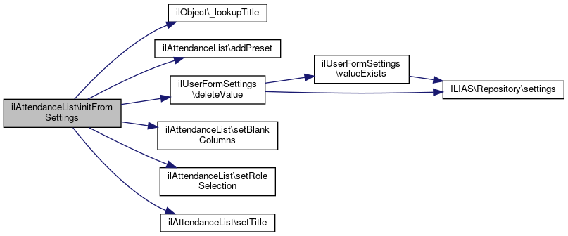 Here is the call graph for this function:| ilAttendanceList::initFromSettings | ( | ) |