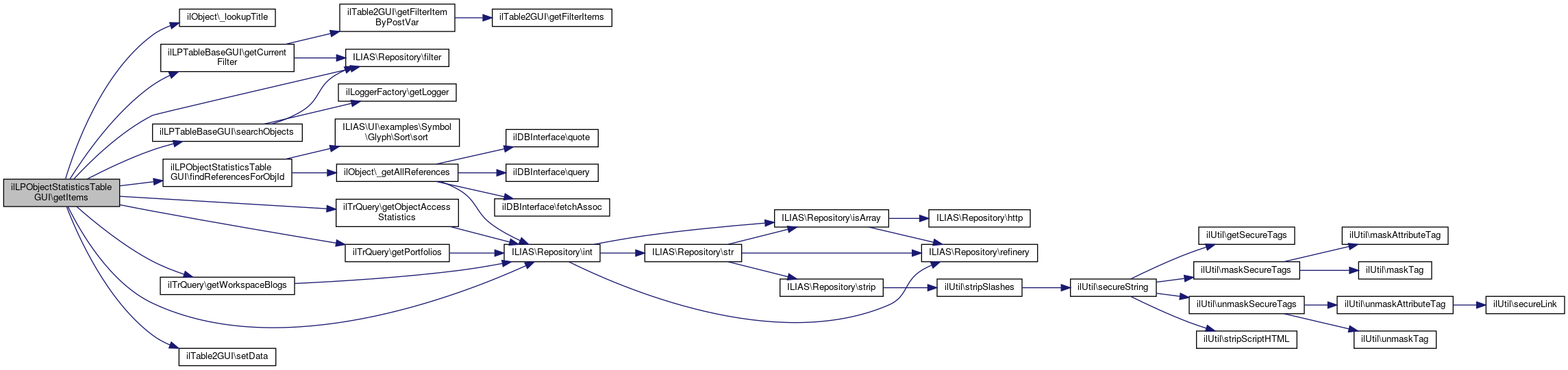 Here is the call graph for this function:| ilLPObjectStatisticsTableGUI::getItems | ( | ) |