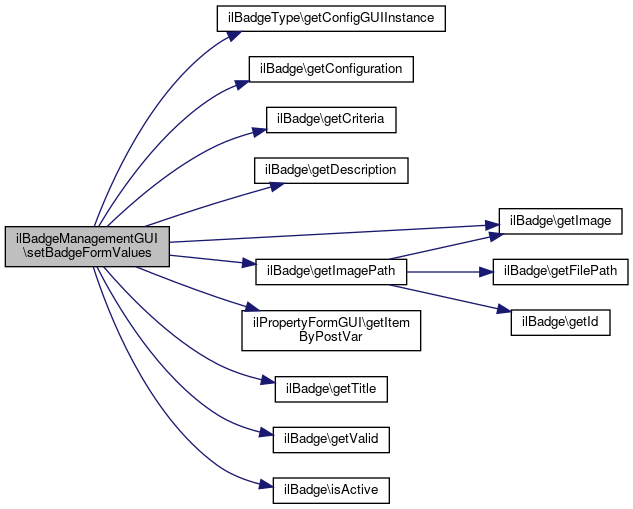 References ilBadgeType\getConfigGUIInstance(), ilBadge\getConfiguration(), ilBadge\getCriteria(), ilBadge\getDescription(), ilBadge\getImage(), ilBadge\getImagePath(), ilPropertyFormGUI\getItemByPostVar(), ilBadge\getTitle(), ilBadge\getValid(), and ilBadge\isActive().