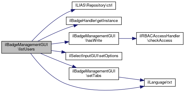 References $ctrl, $lng, $tabs, $tpl, $user_id, ilBadgeAssignment\getAssignedUsers(), ilUserUtil\getNamePresentation(), hasWrite(), ilGlobalTemplateInterface\setContent(), splitBadgeAndUserIdsFromString(), and ilLanguage\txt().