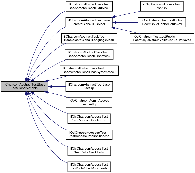 Referenced by ilChatroomAbstractTaskTestBase\createGlobalIlCtrlMock(), createGlobalIlDBMock(), ilChatroomAbstractTaskTestBase\createGlobalIlLanguageMock(), ilChatroomAbstractTaskTestBase\createGlobalIlUserMock(), ilChatroomAbstractTaskTestBase\createGlobalRbacSystemMock(), setUp(), ilObjChatroomAdminAccessTest\setUp(), ilObjChatroomAccessTest\testAccessChecksFail(), ilObjChatroomAccessTest\testAccessChecksSucceed(), ilObjChatroomAccessTest\testGotoCheckFails(), and ilObjChatroomAccessTest\testGotoCheckSucceeds().