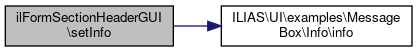 Here is the call graph for this function:| ilFormSectionHeaderGUI::setInfo | ( | string | $a_info | ) |