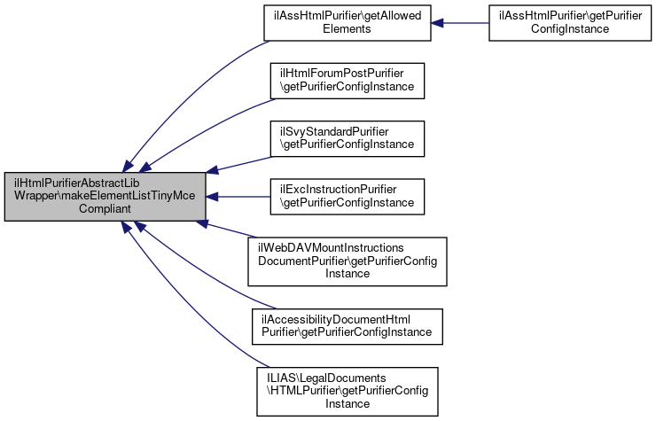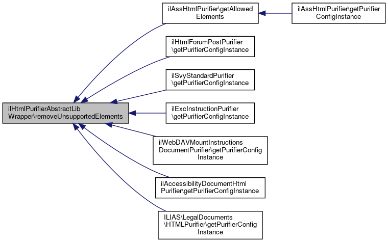 Referenced by ilAssHtmlPurifier\getAllowedElements(), ilHtmlForumPostPurifier\getPurifierConfigInstance(), ilSvyStandardPurifier\getPurifierConfigInstance(), ilExcInstructionPurifier\getPurifierConfigInstance(), ilWebDAVMountInstructionsDocumentPurifier\getPurifierConfigInstance(), ilAccessibilityDocumentHtmlPurifier\getPurifierConfigInstance(), and ILIAS\LegalDocuments\HTMLPurifier\getPurifierConfigInstance().