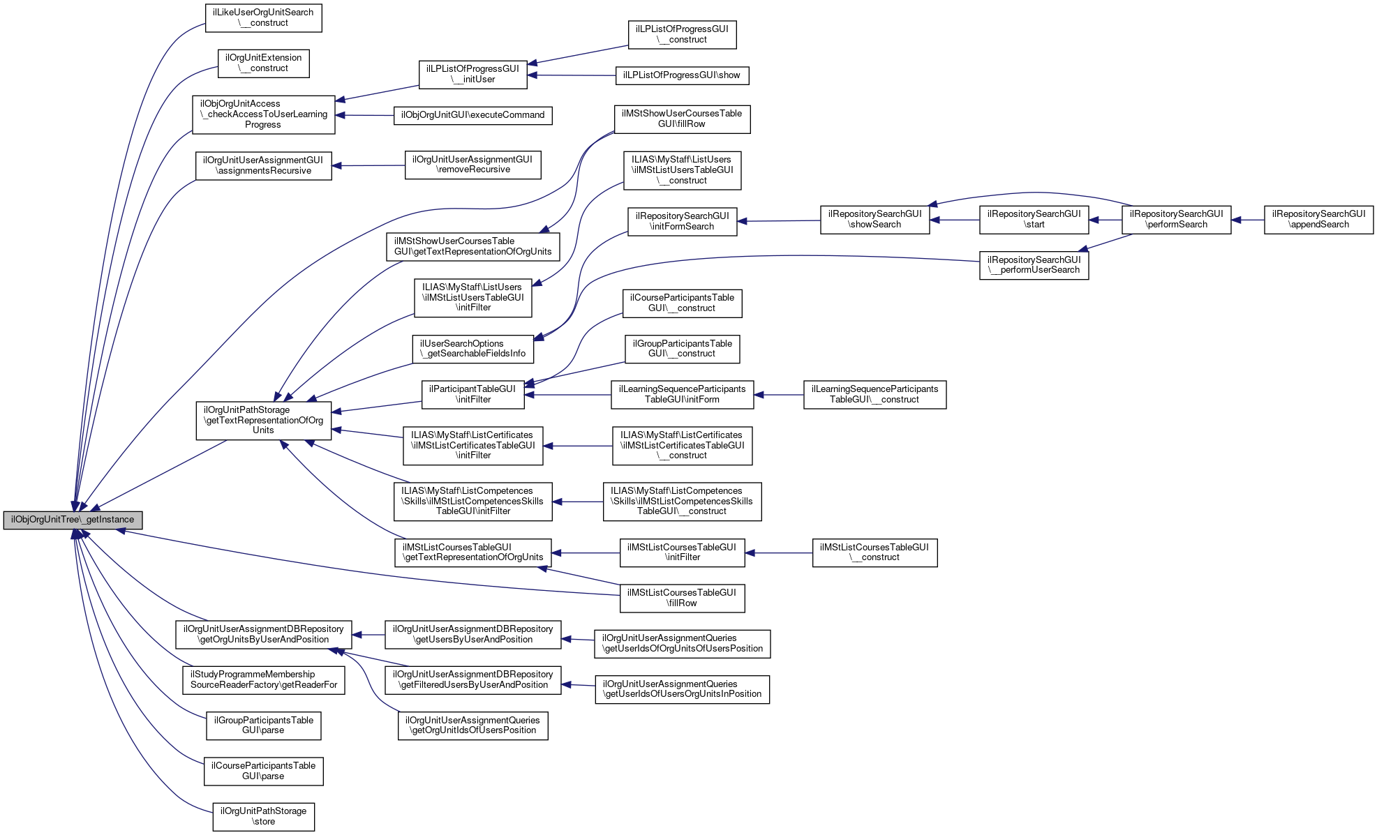 Referenced by ilLikeUserOrgUnitSearch\__construct(), ilOrgUnitExtension\__construct(), ilObjOrgUnitAccess\_checkAccessToUserLearningProgress(), ilOrgUnitUserAssignmentGUI\assignmentsRecursive(), ilMStShowUserCoursesTableGUI\fillRow(), ilMStListCoursesTableGUI\fillRow(), ilOrgUnitUserAssignmentDBRepository\getOrgUnitsByUserAndPosition(), ilStudyProgrammeMembershipSourceReaderFactory\getReaderFor(), ilOrgUnitPathStorage\getTextRepresentationOfOrgUnits(), ilGroupParticipantsTableGUI\parse(), ilCourseParticipantsTableGUI\parse(), and ilOrgUnitPathStorage\store().
