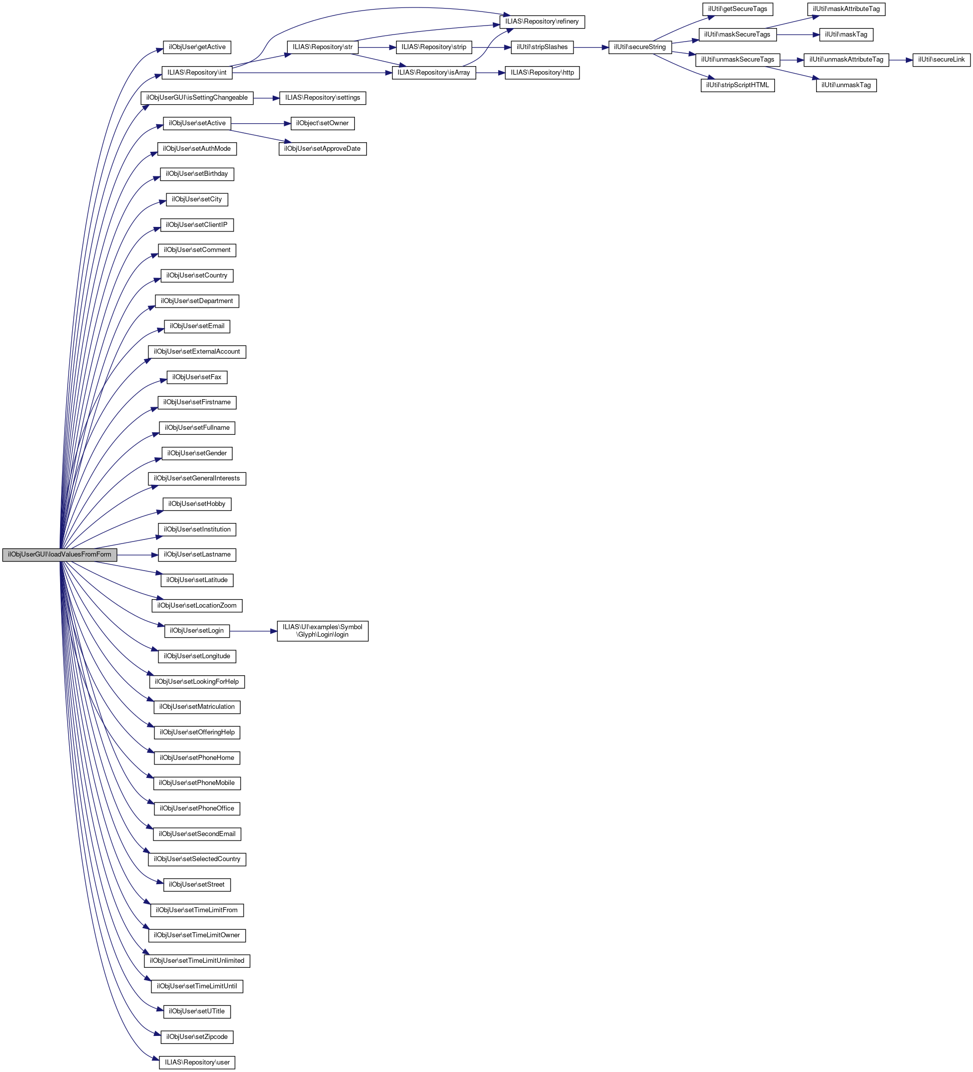 References ilObjectGUI\$object, ilObjectGUI\$user, ilObjUser\getActive(), IL_CAL_DATE, IL_CAL_UNIX, ILIAS\Repository\int(), isSettingChangeable(), ilObjUser\setActive(), ilObjUser\setAuthMode(), ilObjUser\setBirthday(), ilObjUser\setCity(), ilObjUser\setClientIP(), ilObjUser\setComment(), ilObjUser\setCountry(), ilObjUser\setDepartment(), ilObjUser\setEmail(), ilObjUser\setExternalAccount(), ilObjUser\setFax(), ilObjUser\setFirstname(), ilObjUser\setFullname(), ilObjUser\setGender(), ilObjUser\setGeneralInterests(), ilObjUser\setHobby(), ilObjUser\setInstitution(), ilObjUser\setLastname(), ilObjUser\setLatitude(), ilObjUser\setLocationZoom(), ilObjUser\setLogin(), ilObjUser\setLongitude(), ilObjUser\setLookingForHelp(), ilObjUser\setMatriculation(), ilObjUser\setOfferingHelp(), ilObjUser\setPhoneHome(), ilObjUser\setPhoneMobile(), ilObjUser\setPhoneOffice(), ilObjUser\setSecondEmail(), ilObjUser\setSelectedCountry(), ilObjUser\setStreet(), ilObjUser\setTimeLimitFrom(), ilObjUser\setTimeLimitOwner(), ilObjUser\setTimeLimitUnlimited(), ilObjUser\setTimeLimitUntil(), ilObjUser\setUTitle(), ilObjUser\setZipcode(), and ILIAS\Repository\user().