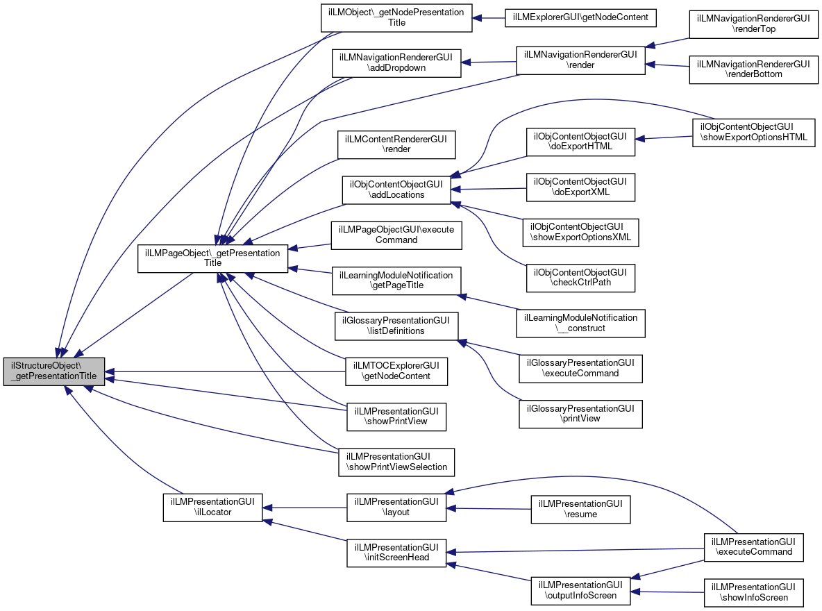 Referenced by ilLMObject\_getNodePresentationTitle(), ilLMPageObject\_getPresentationTitle(), ilLMNavigationRendererGUI\addDropdown(), ilLMTOCExplorerGUI\getNodeContent(), ilLMPresentationGUI\ilLocator(), ilLMPresentationGUI\showPrintView(), and ilLMPresentationGUI\showPrintViewSelection().