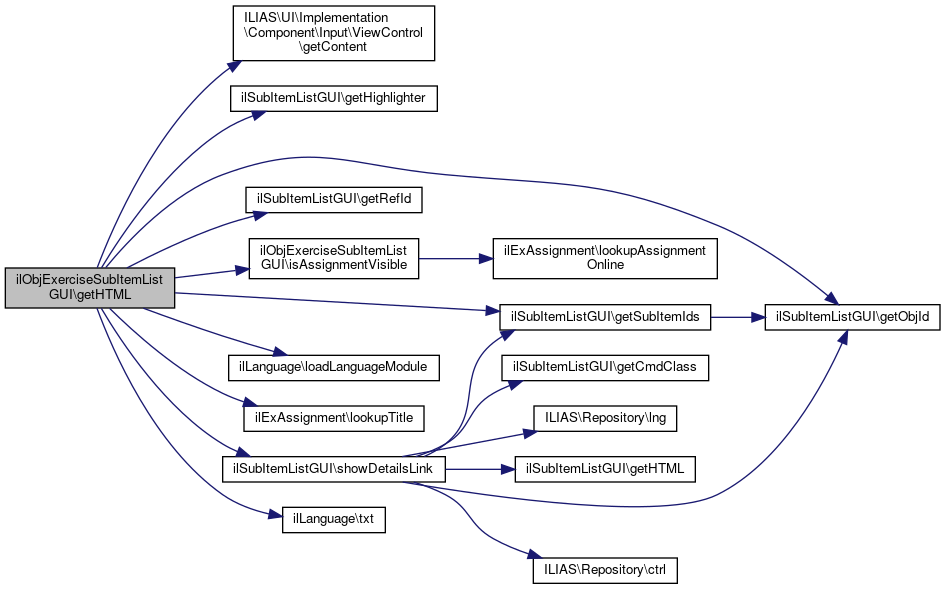 Here is the call graph for this function:| ilObjExerciseSubItemListGUI::getHTML | ( | ) |