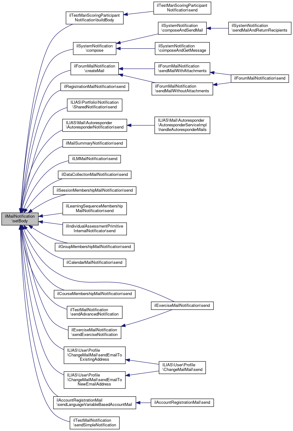 Referenced by ilTestManScoringParticipantNotification\buildBody(), ilSystemNotification\compose(), ilRegistrationMailNotification\send(), ILIAS\Portfolio\Notification\SharedNotification\send(), ILIAS\Mail\Autoresponder\AutoresponderNotification\send(), ilLMMailNotification\send(), ilDataCollectionMailNotification\send(), ilSessionMembershipMailNotification\send(), ilLearningSequenceMembershipMailNotification\send(), ilIndividualAssessmentPrimitiveInternalNotificator\send(), ilGroupMembershipMailNotification\send(), ilCalendarMailNotification\send(), ilExerciseMailNotification\send(), ilCourseMembershipMailNotification\send(), ilTestMailNotification\sendAdvancedNotification(), ilExerciseMailNotification\sendExerciseNotification(), sendMail(), and ilTestMailNotification\sendSimpleNotification().
