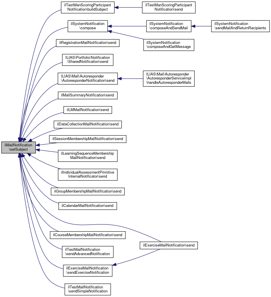 Referenced by ilTestManScoringParticipantNotification\buildSubject(), ilSystemNotification\compose(), ilRegistrationMailNotification\send(), ILIAS\Portfolio\Notification\SharedNotification\send(), ILIAS\Mail\Autoresponder\AutoresponderNotification\send(), ilMailSummaryNotification\send(), ilLMMailNotification\send(), ilDataCollectionMailNotification\send(), ilSessionMembershipMailNotification\send(), ilLearningSequenceMembershipMailNotification\send(), ilIndividualAssessmentPrimitiveInternalNotificator\send(), ilGroupMembershipMailNotification\send(), ilCalendarMailNotification\send(), ilExerciseMailNotification\send(), ilCourseMembershipMailNotification\send(), ilTestMailNotification\sendAdvancedNotification(), ilExerciseMailNotification\sendExerciseNotification(), and ilTestMailNotification\sendSimpleNotification().