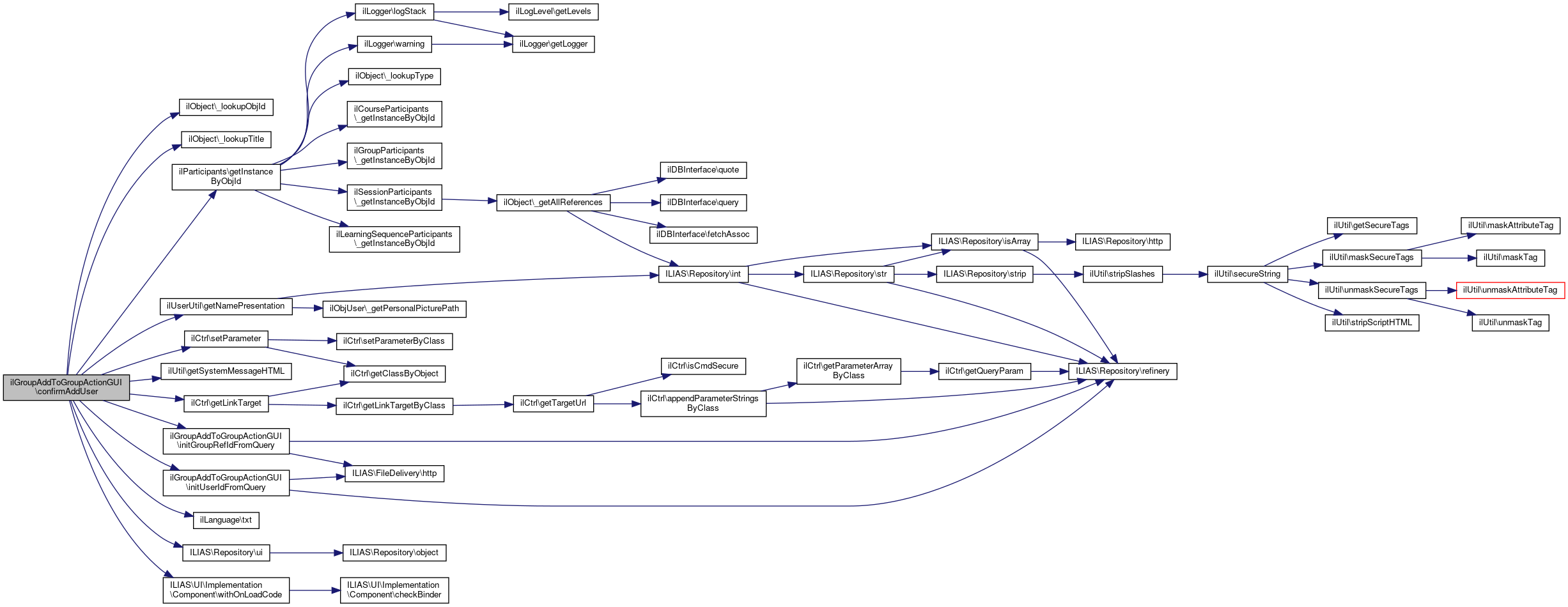 Here is the call graph for this function:| ilGroupAddToGroupActionGUI::confirmAddUser | ( | ) |