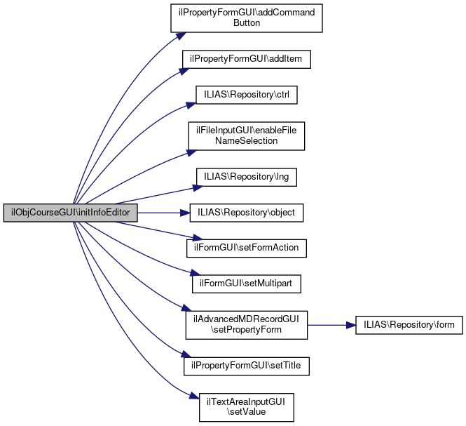 Here is the call graph for this function:| ilObjCourseGUI::initInfoEditor | ( | ) |