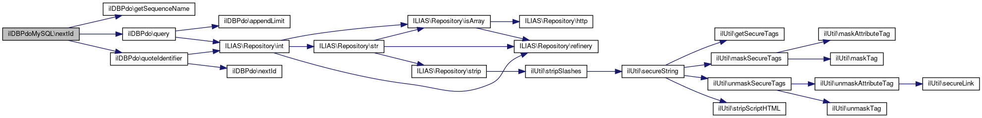 Here is the call graph for this function:| ilDBPdoMySQL::nextId | ( | string | $table_name | ) |