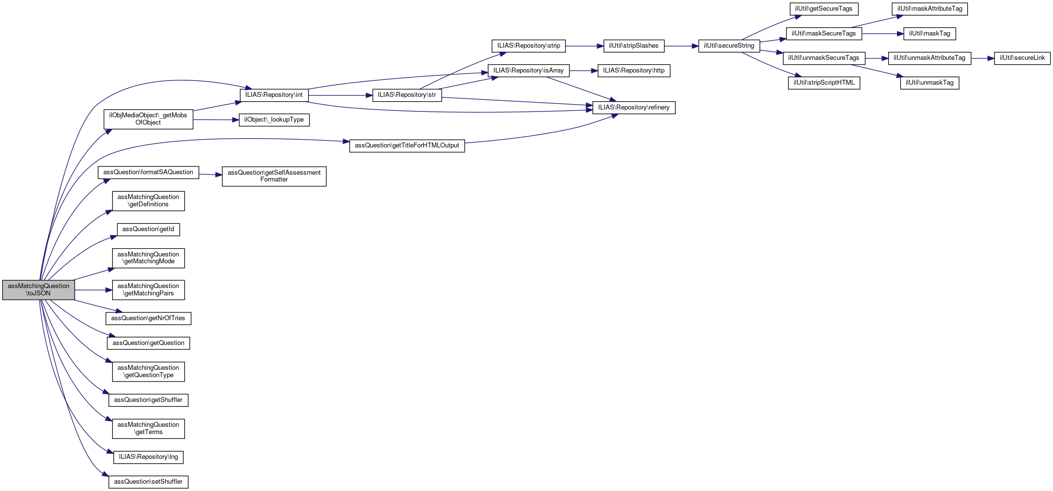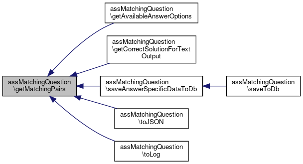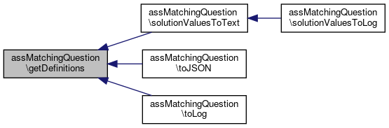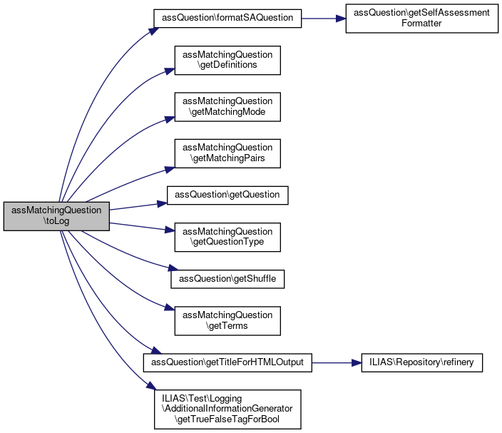 References assQuestion\formatSAQuestion(), getDefinitions(), getMatchingMode(), getMatchingPairs(), assQuestion\getQuestion(), getQuestionType(), assQuestion\getShuffle(), getTerms(), assQuestion\getTitleForHTMLOutput(), and ILIAS\Test\Logging\AdditionalInformationGenerator\getTrueFalseTagForBool().