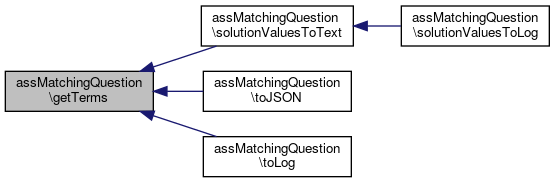 References $definitions, $terms, ilObjMediaObject\_getMobsOfObject(), assQuestion\formatSAQuestion(), getDefinitions(), assQuestion\getId(), getMatchingMode(), getMatchingPairs(), assQuestion\getNrOfTries(), assQuestion\getQuestion(), getQuestionType(), assQuestion\getShuffler(), getTerms(), assQuestion\getTitleForHTMLOutput(), ILIAS\Repository\int(), ILIAS\Repository\lng(), and assQuestion\setShuffler().