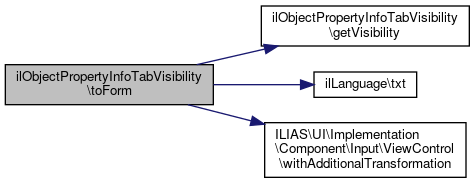 Here is the caller graph for this function:| ilObjectPropertyInfoTabVisibility::toForm | ( | \ilLanguage | $language, |