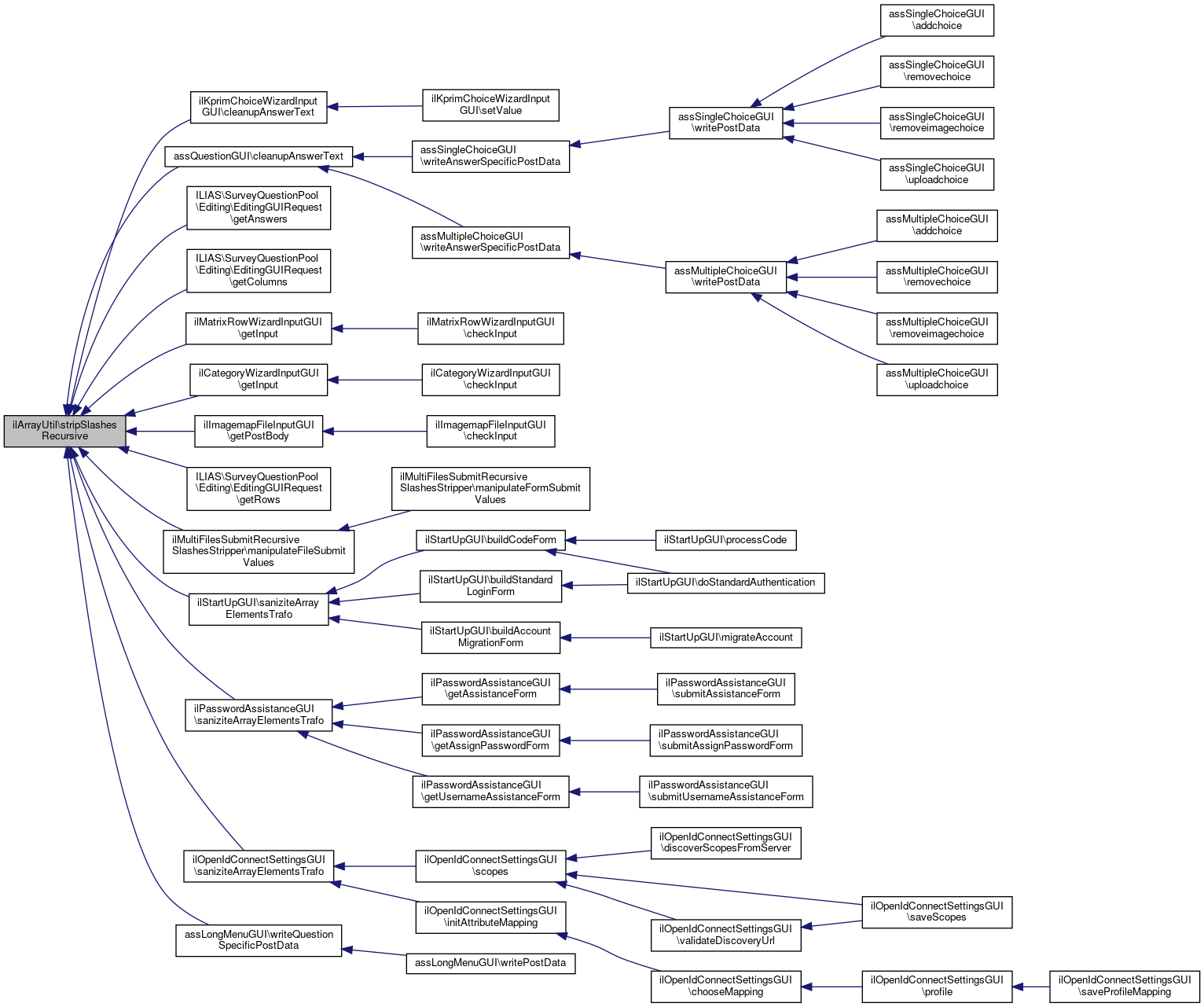 Referenced by ilKprimChoiceWizardInputGUI\cleanupAnswerText(), assQuestionGUI\cleanupAnswerText(), ILIAS\SurveyQuestionPool\Editing\EditingGUIRequest\getAnswers(), ILIAS\SurveyQuestionPool\Editing\EditingGUIRequest\getColumns(), ilMatrixRowWizardInputGUI\getInput(), ilCategoryWizardInputGUI\getInput(), ilImagemapFileInputGUI\getPostBody(), ILIAS\SurveyQuestionPool\Editing\EditingGUIRequest\getRows(), ilMultiFilesSubmitRecursiveSlashesStripper\manipulateFileSubmitValues(), ilStartUpGUI\saniziteArrayElementsTrafo(), ilPasswordAssistanceGUI\saniziteArrayElementsTrafo(), ilOpenIdConnectSettingsGUI\saniziteArrayElementsTrafo(), and assLongMenuGUI\writeQuestionSpecificPostData().