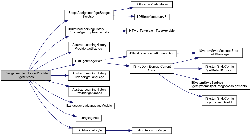 Here is the call graph for this function:| ilBadgeLearningHistoryProvider::getEntries | ( | int | $ts_start, |