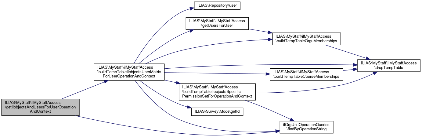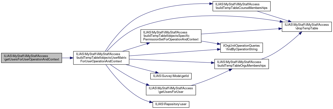 References $context, $DIC, $GLOBALS, $q, ILIAS\MyStaff\ilMyStaffAccess\buildTempTableCourseMemberships(), ILIAS\MyStaff\ilMyStaffAccess\buildTempTableIlobjectsSpecificPermissionSetForOperationAndContext(), ILIAS\MyStaff\ilMyStaffAccess\buildTempTableOrguMemberships(), ILIAS\MyStaff\ilMyStaffAccess\dropTempTable(), ilOrgUnitOperationQueries\findByOperationString(), ILIAS\Survey\Mode\getId(), ILIAS\MyStaff\ilMyStaffAccess\getUsersForUser(), and ILIAS\Repository\user().