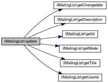 Here is the caller graph for this function:| ilMailingList::update | ( | ) |