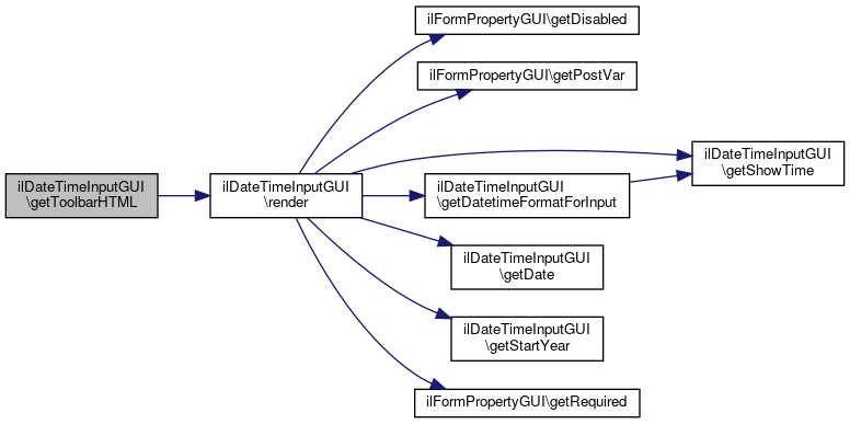 Here is the call graph for this function:| ilDateTimeInputGUI::getToolbarHTML | ( | ) |
