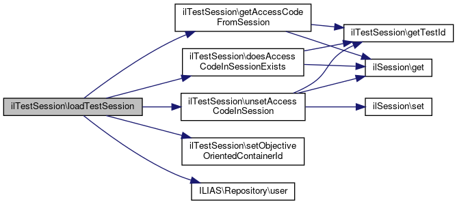 Here is the call graph for this function:| ilTestSession::loadTestSession | ( | int | $test_id, |