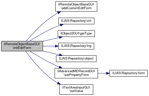 Here is the call graph for this function:| ilRemoteObjectBaseGUI::editObject | ( | ilPropertyFormGUI | $form = null | ) |