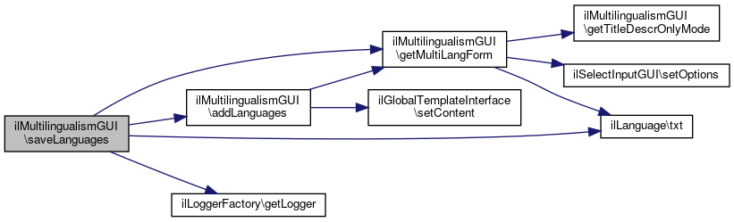 Here is the call graph for this function:| ilMultilingualismGUI::saveLanguages | ( | ) |