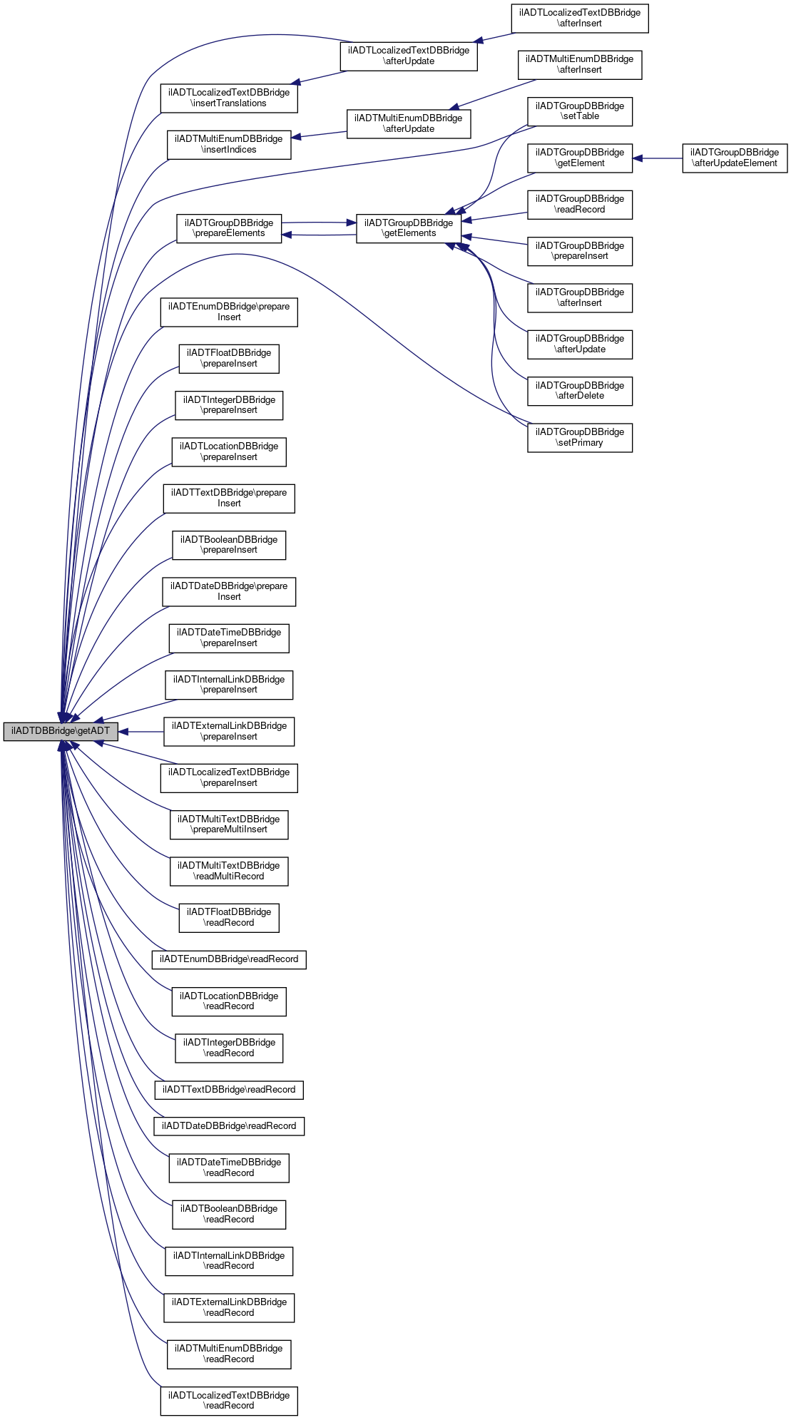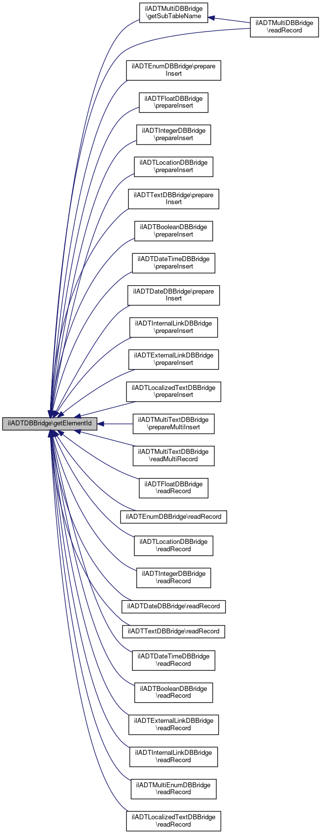 Referenced by ilADTMultiDBBridge\getSubTableName(), ilADTEnumDBBridge\prepareInsert(), ilADTFloatDBBridge\prepareInsert(), ilADTIntegerDBBridge\prepareInsert(), ilADTLocationDBBridge\prepareInsert(), ilADTTextDBBridge\prepareInsert(), ilADTBooleanDBBridge\prepareInsert(), ilADTDateTimeDBBridge\prepareInsert(), ilADTDateDBBridge\prepareInsert(), ilADTInternalLinkDBBridge\prepareInsert(), ilADTExternalLinkDBBridge\prepareInsert(), ilADTLocalizedTextDBBridge\prepareInsert(), ilADTMultiTextDBBridge\prepareMultiInsert(), ilADTMultiTextDBBridge\readMultiRecord(), ilADTFloatDBBridge\readRecord(), ilADTEnumDBBridge\readRecord(), ilADTLocationDBBridge\readRecord(), ilADTIntegerDBBridge\readRecord(), ilADTDateDBBridge\readRecord(), ilADTTextDBBridge\readRecord(), ilADTDateTimeDBBridge\readRecord(), ilADTMultiDBBridge\readRecord(), ilADTBooleanDBBridge\readRecord(), ilADTExternalLinkDBBridge\readRecord(), ilADTInternalLinkDBBridge\readRecord(), ilADTMultiEnumDBBridge\readRecord(), and ilADTLocalizedTextDBBridge\readRecord().