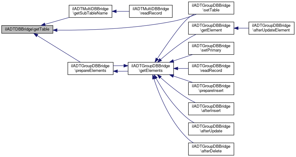 Here is the caller graph for this function:| ilADTDBBridge::getTable | ( | ) |