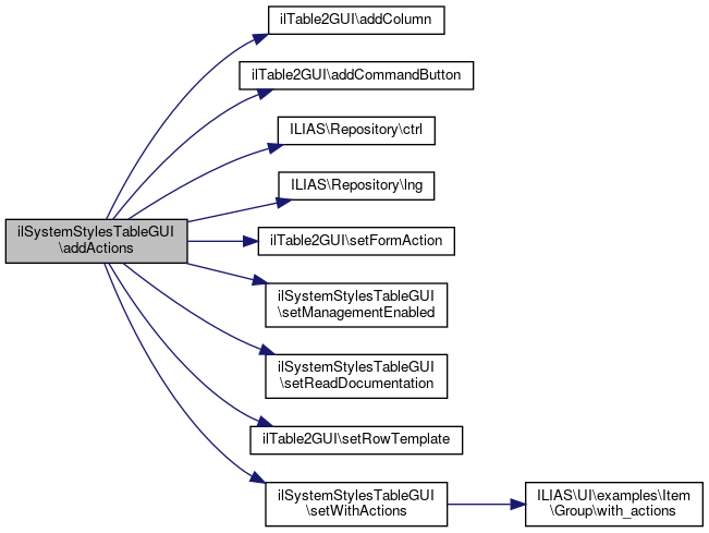 References ilTable2GUI\addColumn(), ilTable2GUI\addCommandButton(), ILIAS\Repository\ctrl(), ILIAS\Repository\lng(), ilTable2GUI\setFormAction(), setManagementEnabled(), setReadDocumentation(), ilTable2GUI\setRowTemplate(), and setWithActions().