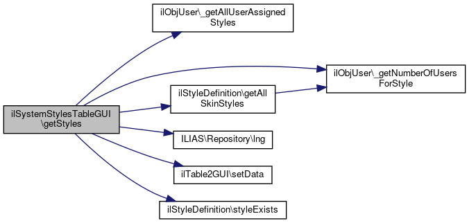 Here is the call graph for this function:| ilSystemStylesTableGUI::getStyles | ( | ) |