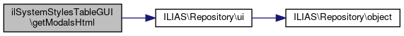 Here is the call graph for this function:| ilSystemStylesTableGUI::getModalsHtml | ( | ) |
